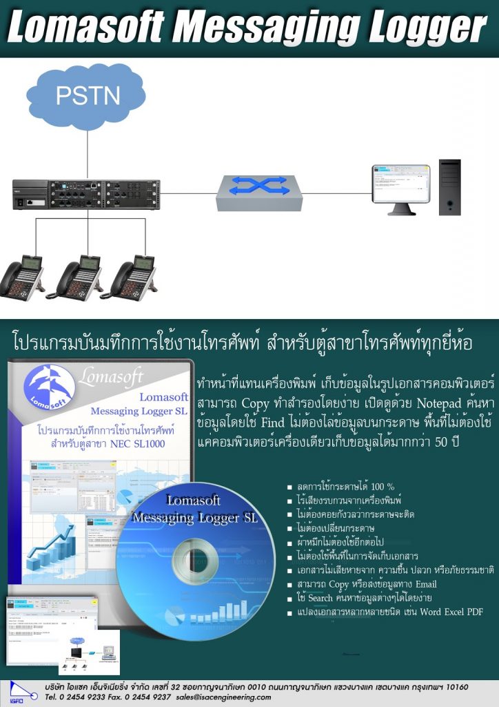 - โปรแกรมบันทึกการใช้งานโทรศัพท์ ( SMDR ) สำหรับตู้สาขา IP PBX NEC SL1000 โดยเฉพาะทำหน้าที่รับข้อมูลจาก LAN Port ทั้งข้อมูล โทรเข้า โทรออก รับสายและไม่ได้รับสายแสดงทุกหมายเลข เก็บข้อมูลในรูปแบบ TEXT File