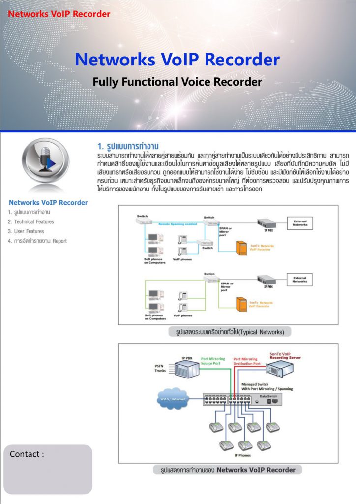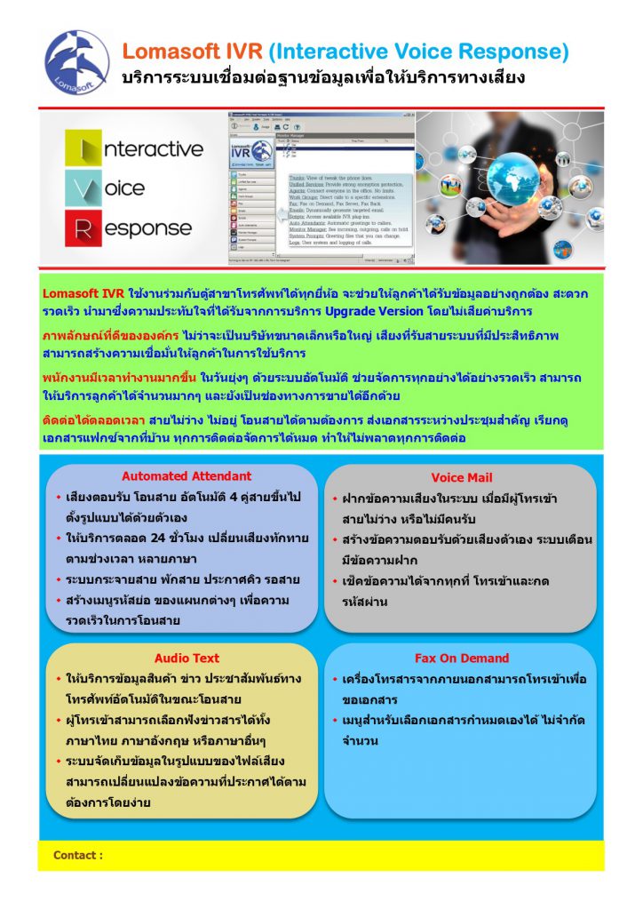 Software พฤษภาคม 28, 2020 admin Products 0 Networks VoIP Recorder ระบบบันทึกเสียงสนทนา VoIP Lomasoft Telephone Billing System ระบบบันทึกการใช้งานและคิดค่าโทรของโทรศัพท์ทุกเครื่องภายในองค์กร Telephone Voice Recording System ( TVRS ) ระบบบันทึกเสียงสนทนาทางโทรศัพท์ Lomasoft IVR (Interactive Voice Response) บริการระบบเชื่อมต่อฐานข้อมูลเพื่อให้บริการทางเสียง Lomasoft Emergency Call System โทรแจ้งเตือนอัตโนมัติเมื่อมีเหตุการณ์ฉุกเฉิน Lomasoft CTI Wake Up Call โปรแกรมตั้งปลุกทางโทรศัพท์อัตโนมัติ Lomasoft Calldashboard Monitor หนึ่งในระบบผู้ช่วยวิเคราะห์สถิติด้านการใช้โทรศัพท์ในสำนักงานเพื่อการพัฒนาระบบงาน Lomasoft LDR โปรแกรมเชื่อมต่อข้อมูลระหว่างสาขา