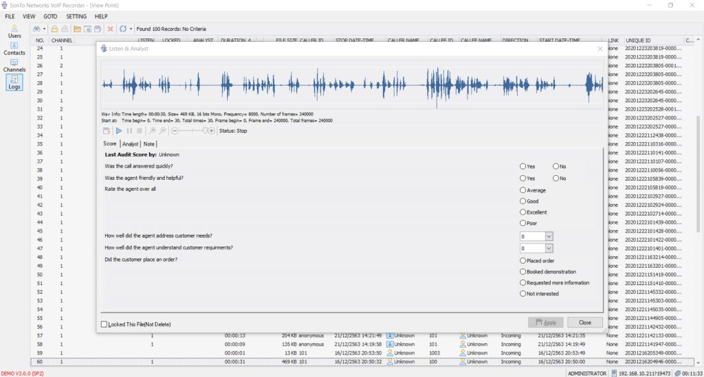 – สามารถเข้าฟังเสียงและจัดการข้อมูลเสียงได้ง่าย โดยสามารถประเมินผลการสนทนาผ่านระบบ ดังนี้
