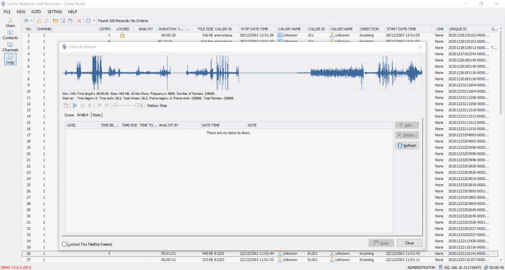 – สามารถตรวจสอบสถานการณ์บันทึกเสียงแบบ Real-Time และสามารถฟังการบันทึกเสียง Real-Time ที่กำลังบันทึกขณะนั้น (Real-Time Monitoring and Listening to the Recording Conversation)